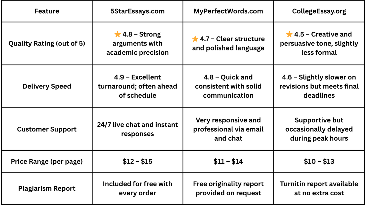 After testing all three reliable essay writing platforms, I can confidently say that each service shines in its own way. 5StarEssays.com impressed me with its research depth and academic structure, ideal for students who want solid, debate-ready arguments. MyPerfectWords.com stood out for its clarity, polish, and fast delivery perfect for those who value precision and quick turnaround without sacrificing quality. And CollegeEssay.org delivered creative, well-balanced essays with a more engaging and natural writing flow, ideal for topics that need personality and emotional pull.